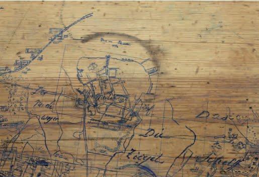 Comme base pour Implantation Schwerin, Manenti a choisi une table de travail datant du début du siècle. Les traces d´usure qu´elle porte fait analogie avec le caractère historique du projet.